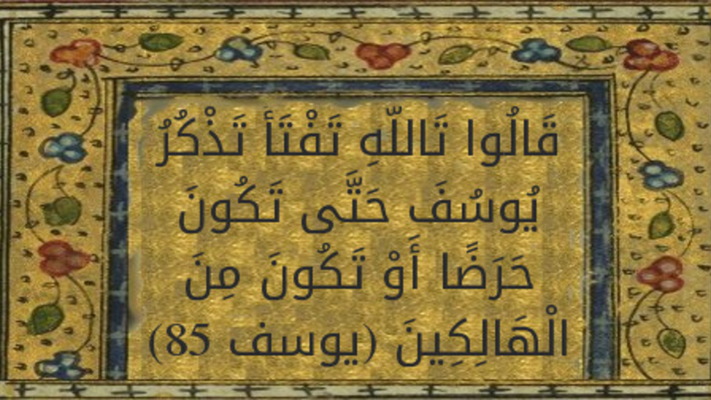 {قَالُوا تَاللَّهِ تَفْتَأُ تَذْكُرُ يُوسُفَ حَتَّى تَكُونَ حَرَضًا أَوْ تَكُونَ مِنَ الْهَالِكِينَ} [يوسف : 85] أي تشتغل بذكر يوسف منفصلاً عن أمور أخرى ومنقطعًا عن ذكر غيره. وأمّا تقدير النافية: فهو خلاف الأصل، وخلاف مقام القرآن الكريم، مضافًا إلى اختلال في سلاسة المعنى وبيان المقصود.