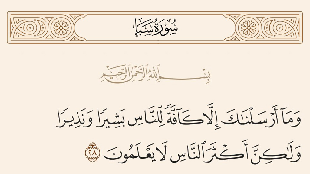 وفي البداية يأمر الله تعالى رسول الله قائلاً: {قُلْ يَا أَيُّهَا النَّاسُ إِنِّي رَسُولُ اللَّهِ إِلَيْكُمْ جَمِيعًا} [الأعراف: 158]. إنّ هذه الآية مثل آيات كثيرة أخرى من القرآن الكريم دليل واضح على عالمية دعوة رسول الله (صلى الله عليه وآله وسلم). وفي الآية (28) من سورة «سبأ» أيضاً نقرأ: {وما أرسلناك إلاّ كافة للناس}.