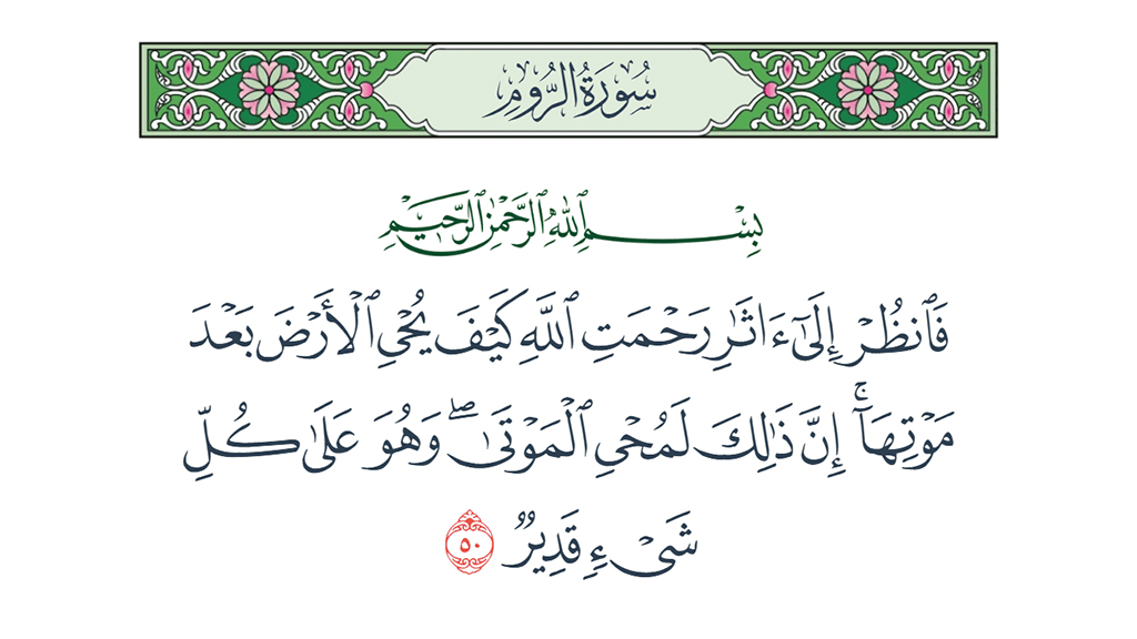 قال تعالى: {فَانْظُرْ إِلَى آثَارِ رَحْمَتِ اللَّهِ كَيْفَ يُحْيِ الْأَرْضَ بَعْدَ مَوْتِهَا إِنَّ ذَلِكَ لَمُحْيِ الْمَوْتَى وَهُوَ عَلَى كُلِّ شَيْءٍ قَدِيرٌ} [الروم : 50].